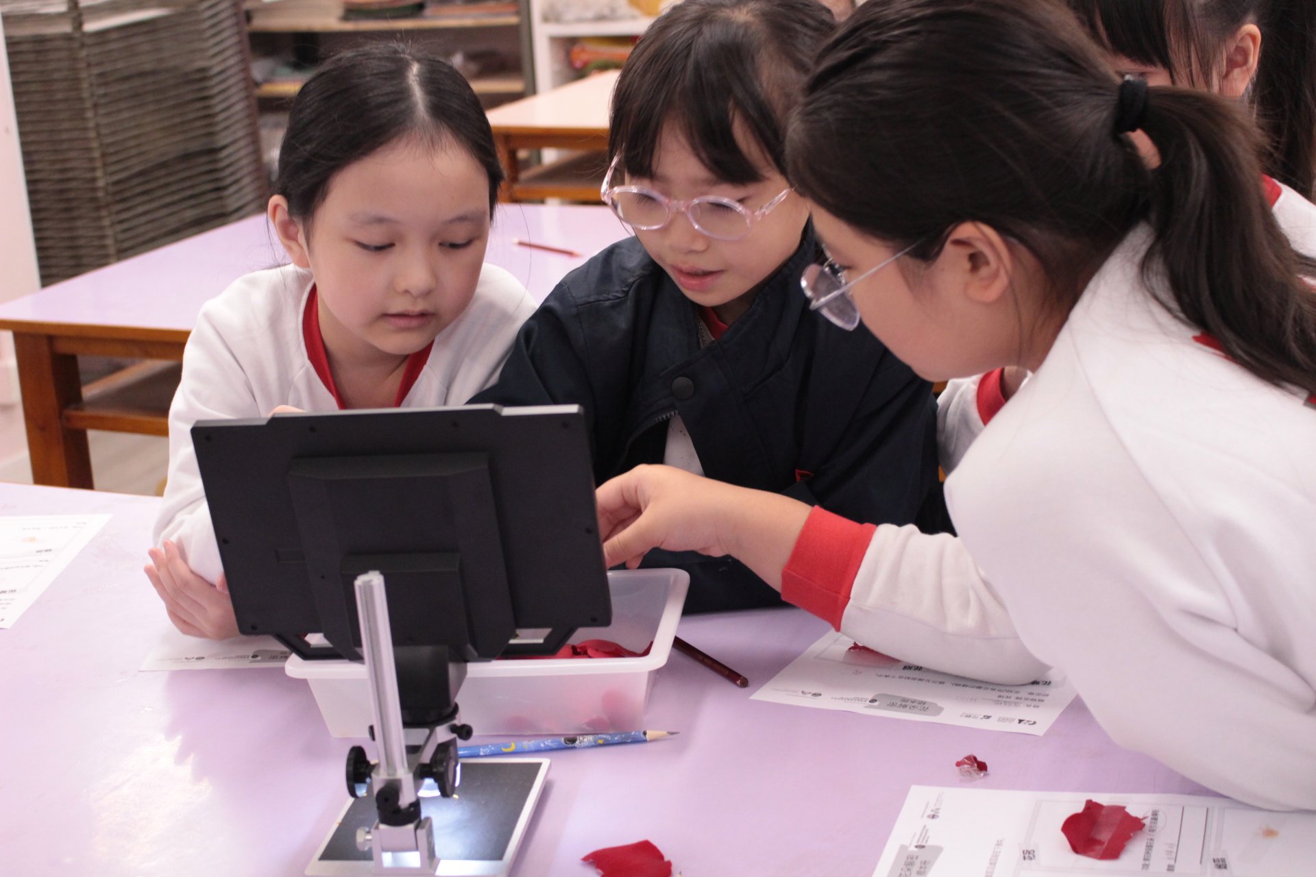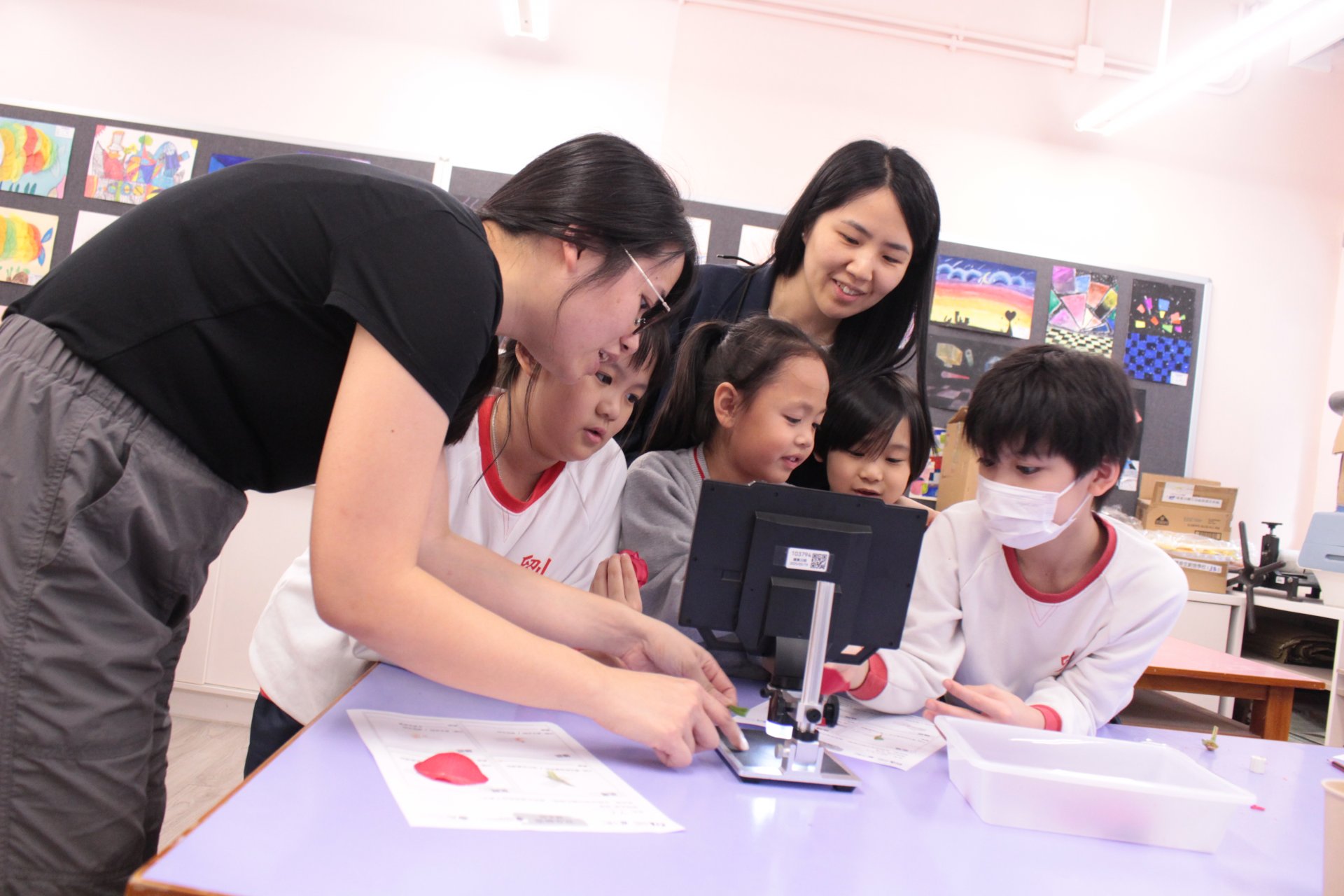 小小樂德人小心翼翼地用鑷子和放大鏡,一層一層地解開花朵的「神祕面紗」。從花萼、花冠、雄蕊到雌蕊,樂德人親手找出花朵的每一個部位。看着樂德人專注的眼神和完成標本冊時滿足的笑容,這應該就是老師們教學時看到最美的「風景」。更令人驚喜的是,當孩子們透過顯微鏡,第一次親眼看到花粉粒宛如外星星球般的紋路,以及植物細胞如拼圖般緊密排列的組織時,教室裏瞬間充滿了此起彼伏的「哇!」聲。那個瞬間,平常肉眼看不見的世界,在他們眼前綻放了無比絢麗的科學光芒。